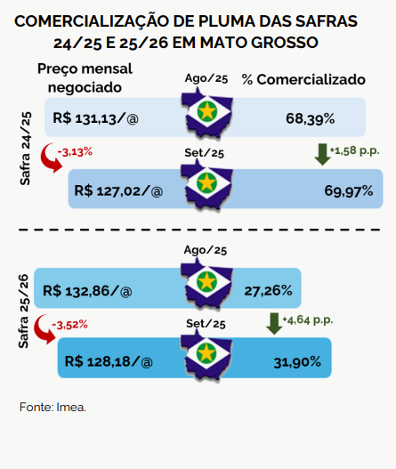 A comercialização da pluma da safra 24/25 atingiu, em set/25, 69,97% da produção estimada, avanço de 1,58 p.p. no comparativo mensal