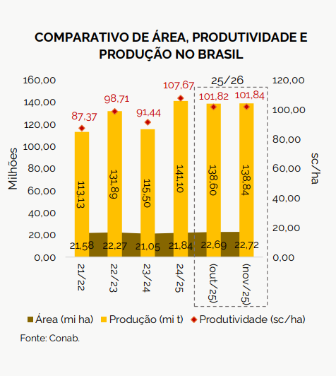No que se refere à produtividade, a Conab estimou em 101,84 sc/ha, queda de 5,42% em relação ao ciclo anterior. Esse recuo está relacionado à instabilidade climática registrada nas regiões Sul e Sudeste na primeira safra de milho, que vem comprometendo o desenvolvimento das lavouras e afetando a perspectiva de rendimento. Por fim, a produção foi projetada em 138,84 mi de t, registrando queda de 1,60% frente ao ciclo anterior.