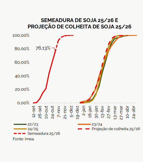 A semeadura da soja da safra 2025/26 em Mato Grosso atingiu 76,13% da área prevista, avançando 16,08 p.p. em relação à semana anterior