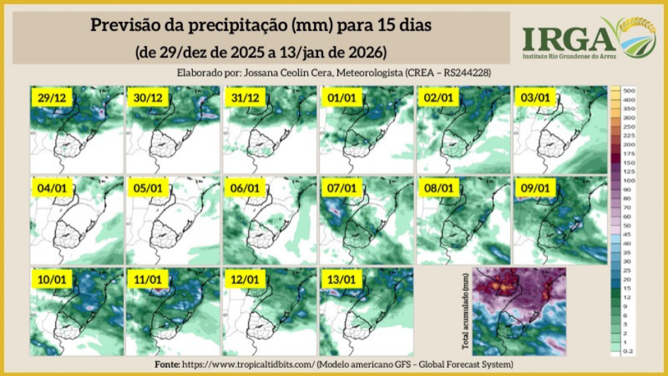 Quinta-feira (01/01) e Sexta-feira (02/01): Tem previsão de chuva para os dois primeiros dias de 2026, em todo o RS. Os volumes deverão variar entre 10 e 20 mm/dia.