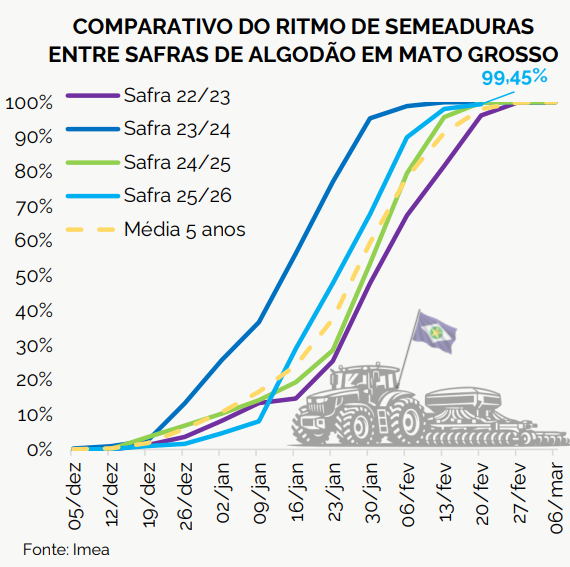 Assim, até a última sexta-feira (20/02), a semeadura do algodão em Mato Grosso alcançou 99,45%, avanço de 1,42 p.p. quando comparada à semana anterior. Nas áreas de segunda safra, o ritmo de conclusão ainda acompanha o andamento da colheita da soja, que tem sido dificultada devido às condições climáticas desfavoráveis em algumas regiões. Ainda assim, a expectativa é de que os trabalhos sejam finalizados nos próximos dias, considerando que diversos municípios do estado já encerraram a semeadura.