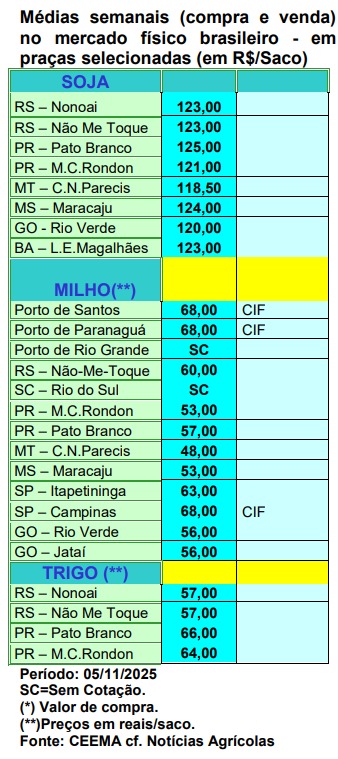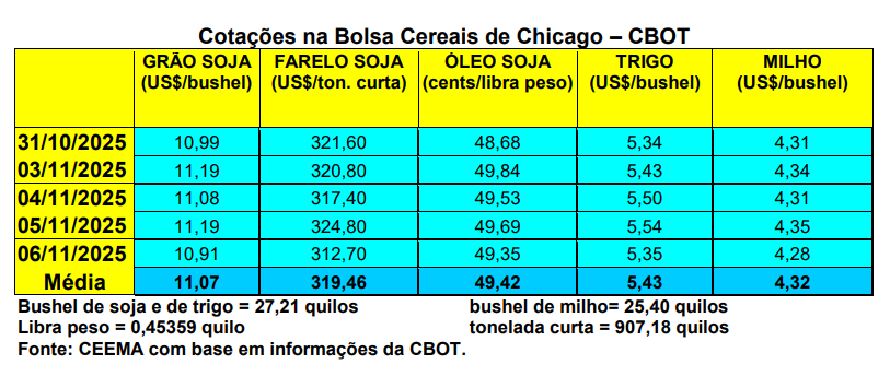 A cotação do trigo, em Chicago, também subiu nesta semana. O bushel do cereal, para o primeiro mês cotado, após registrar US$ 4,96 no dia 13/10, se recuperou constantemente, chegando a bater em US$ 5,54 no dia 05/11 (o mais alto valor desde o dia 02/07/2025). Todavia, no dia seguinte (06) o fechando recuou para US$ 5,35/bushel, contra US$ 5,24 uma semana antes.