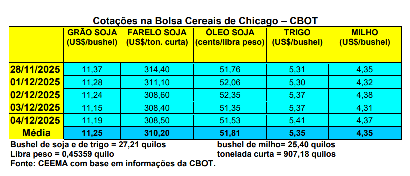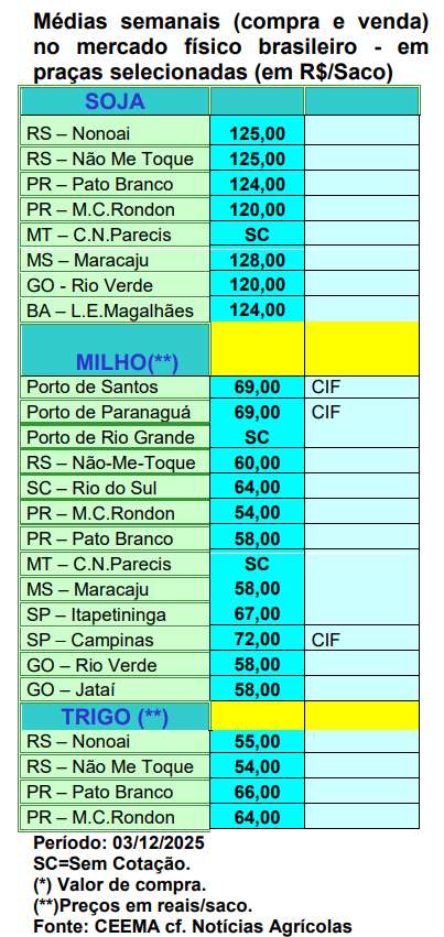 Quanto aos embarques de soja estadunidense para a China, os mesmos estão se acelerando neste final de ano. Uma sétima carga teria sido enviada aos chineses na semana anterior. De acordo com o governo dos EUA, os chineses deverão comprar 12 milhões de toneladas de soja até o final do ano, porém, a China não confirmou a informação. Por enquanto, “os importadores chineses reservaram quase 2 milhões de toneladas de soja dos EUA no mês passado, para embarque no ano comercial de 2025/26, que termina em agosto de 2026, embora apenas compras mínimas tenham sido confirmadas desde então”. O total de compras chinesas continua bem abaixo dos volumes registrados antes da guerra comercial (cf. Reuters).