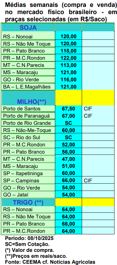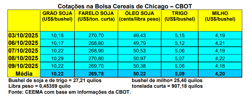 As cotações da soja voltaram a subir um pouco nesta semana. Havia um relatório de oferta e demanda do USDA previsto para este dia 09/10, porém, com a situação de “shutdown” nas contas públicas dos EUA, o serviço público estadunidense paralisou há uma semana e, com isso, o relatório não foi divulgado e o mercado está à mercê de especulações, pois sem estatísticas confiáveis.