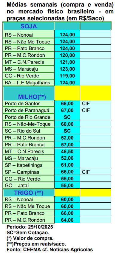 Já no Brasil, os preços continuam relativamente estáveis. A média gaúcha fechou a semana em R$ 62,56/saco, enquanto as principais praças locais continuaram com R$ 60,00. Já nas demais regiões do Brasil os preços do cereal oscilaram entre R$ 48,50 e R$ 61,00/saco.