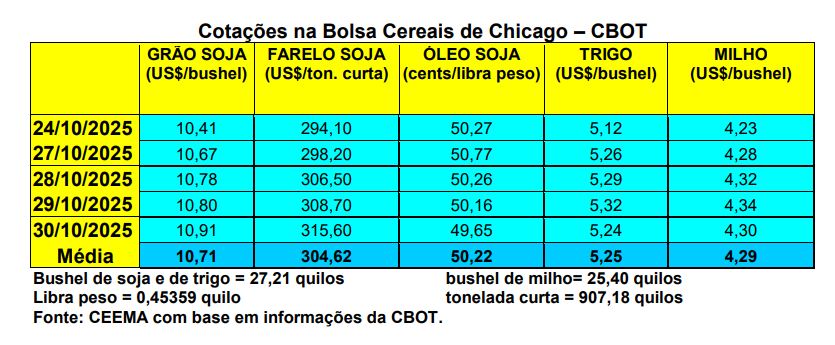 Dito isso, o plantio da safra de verão 2025/26 atingiu, no dia 23/10, a 55% da área esperada no Centro-Sul brasileiro, estando levemente mais adiantado do que o plantio realizado no mesmo período do ano anterior. O Sul do país estando com o plantio praticamente encerrado (98% no Paraná e 90% no Rio Grande do Sul), o mercado volta suas atenções para a semeadura no Sudeste e Centro-Oeste (cf. AgRural).