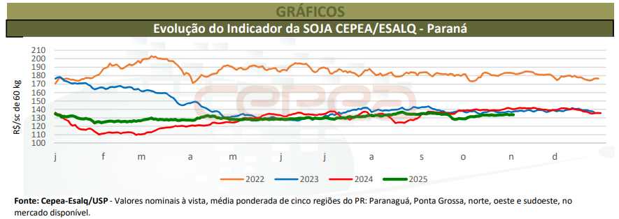 Com isso, no Brasil, como era de se esperar, houve pressão sobre os prêmios de exportação, com os contratos para embarque em 2026 retornando a patamares negativos – movimento que não era registrado desde julho deste ano. Esse cenário impediu altas de preços no mercado brasileiro.