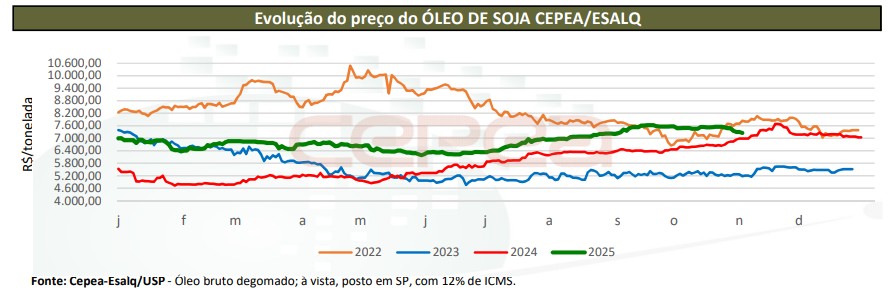 Levantamento do Cepea mostra que o óleo de soja posto na região de São Paulo, com 12% de ICMS, se desvalorizou ligeiro 0,3% em relação a setembro, mas subiu expressivos 10,1% sobre outubro/24 em termos reais, a R$ 7.470,43/t. Na CME Group, o contrato de primeiro vencimento teve média de US$ 0,5024/lp (US$ 1.107,59/t) em outubro, também 0,3% inferior à de setembro, mas 18% acima da de outubro/24.
