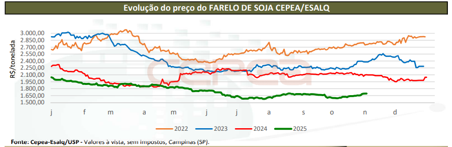 FARELO DE SOJA – Os futuros do farelo de soja subiram na Bolsa de Chicago, em outubro. Esse movimento está atrelado à maior demanda, sobretudo norte-americana – o consumo do derivado costuma aumentar no período que antecede o inverno no Hemisfério Norte, especialmente para produção de ração. O contrato Dez/25 do farelo se valorizou 1,4% de setembro para outubro, passando para US$ 283,41/tonelada curta (US$ 312,41/t) no último mês – o maior patamar desde junho deste ano. Já no comparativo anual, observa-se baixa de 10,8%.