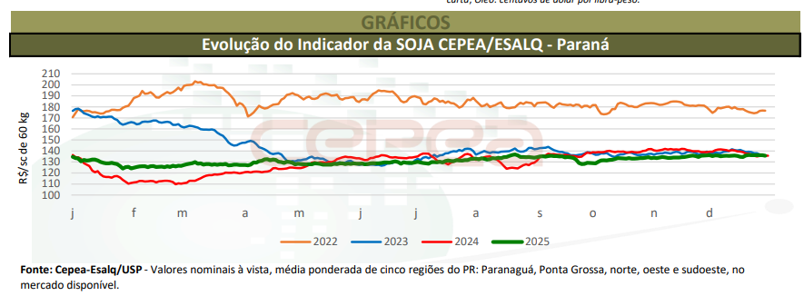 Os Indicadores CEPEA/ESALQ – Paranaguá (PR) e CEPEA/ESALQ Paraná registraram em 2025 as menores médias anuais desde 2019, em termos reais (deflacionamento pelo IGP-DI de novembro/25), de R$ 135,66/saca e R$ 130,10/sc de 60 kg, respectivamente, recuos de 1,9% e de 2,9% frente às de 2024.