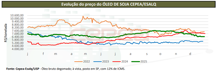O consumo doméstico de óleo alcançou 10,6 milhões de toneladas, impulsionado pela elevação da mistura obrigatória de biodiesel de B14 para B15, válida a partir de agosto. Nesse período, os preços do óleo de soja bruto e degomado superaram R$ 7.000/tonelada, com média anual de R$ 6.786,94/tonelada, alta real de 11,6% em relação a 2024 e a maior média desde 2022.