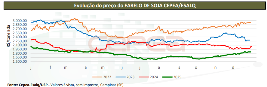 Na Bolsa de Chicago (CME Group), o contrato de primeiro vencimento da oleaginosa caiu 5,7% no comparativo anual, à média de US$ 10,38/bushel em 2025 (até 22/12), a menor desde 2020, em termos nominais.
