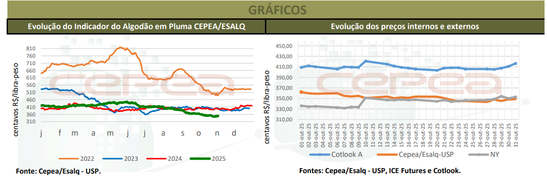 Parte dos agentes permanece concentrada no cumprimento de contratos a termo, mantendo-se retraída de novas negociações. O beneficiamento da pluma da safra 2024/25 já passou da metade, o que vem contribuindo para que o ritmo de exportação da commodity ganhasse força em outubro. Produtores também têm direcionado a atenção às atividades de campo relacionadas ao plantio da nova temporada de grãos. Ainda assim, o Cepea observou, ao longo de outubro, boa movimentação de negócios envolvendo a pluma da safra 2024/25 e também da temporada seguinte, a 2025/26.