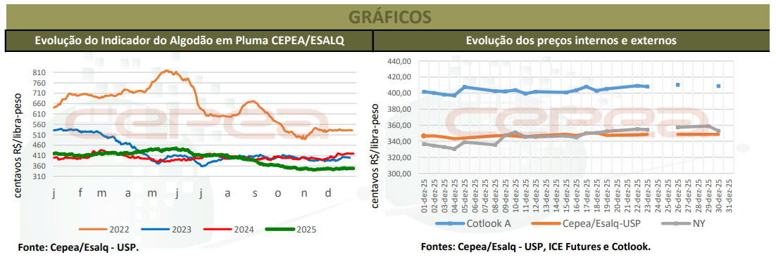A partir de junho, contudo, os valores da pluma passaram a recuar com maior intensidade, pressionados pelas quedas externas e do dólar, além da intensificação das vendas de estoques remanescentes da safra 2023/24 e da aproximação do volume recorde de 2024/25. A necessidade de “fazer caixa”, aliada ao elevado nível de estoques, reforçou o viés baixista ao longo do segundo semestre.