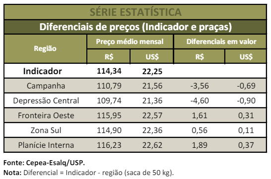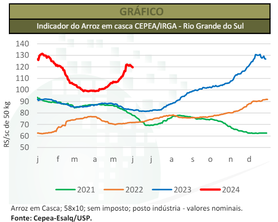 PREÇOS REGIONAIS – De 30 de abril a 31 de maio, o Indicador CEPEA/IRGA-RS (58% de grãos inteiros, com pagamento à vista) avançou 11,68%, fechando a R$ 119,63/sc de 50 kg no dia 31. No comparativo mensal, a valorização foi de expressivos 12,19%, de R$ 101,91/sc de 50 kg em abril/24 para R$ 114,34/sc em maio/24.