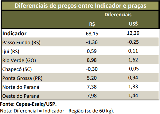PREÇOS – O Indicador ESALQ/BM&FBovespa caiu 3% no acumulado de junho, fechando a R$ 67,02/saca de 60 kg no dia 30. A média mensal cedeu expressivos 7% em relação a maio, para o menor patamar do ano, em termos nominais. Na média das regiões pesquisadas pelo Cepea, o cereal se desvalorizou 8,1% no mercado de balcão (ao produtor) e 6,5% no de lotes (negociação entre empresas) também no acumulado de junho. A médias mensais ficaram 8,2% e 7,8% inferiores às de maio, respectivamente.