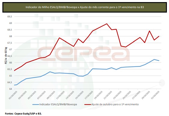 Na B3, os valores foram impulsionados pela demanda mais ativa em partes do mês e pelo avanço dos preços internacionais do cereal. Os vencimentos Nov/25 e Jan/26 subiram fortes 4,2% e 5%, fechando a R$ 68 e R$ 71,44/saca de 60 kg no dia 31 de outubro, respectivamente.