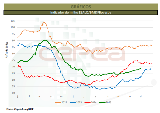 Os preços do milho seguiram firmes em novembro na maior parte das regiões acompanhadas pelo Cepea. O suporte veio da retração de vendedores, que continuaram focados nas atividades envolvendo a semeadura da safra verão. A demanda também registrou aumento em novembro. Parte dos consumidores que priorizava o uso de estoques e/ou aguardava desvalorização voltou ao mercado, no intuito de recompor os estoques e se programar para o final de 2025 – vale lembrar que as últimas semanas do ano são marcadas pela menor liquidez, sobretudo devido à paralisação de transportadoras.