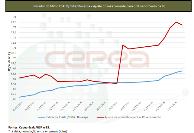 Na média das regiões pesquisadas pelo Cepea, o cereal valorizou 0,9% no mercado de balcão (ao produtor) e 2,4% no de lotes (negociação entre empresas) também no acumulado de novembro. As médias mensais superaram em respectivos 1,2% e 1,9% as de outubro. Na B3, a demanda aquecida, as altas dos preços internacionais e as atenções voltadas ao desenvolvimento da safra verão impulsionaram os futuros durante a maior parte do mês. Os vencimentos Jan/26 e Mar/26 subiram 2% fechando a R$ 73,22 e R$ 74,91/sc de 60 kg no dia 28.