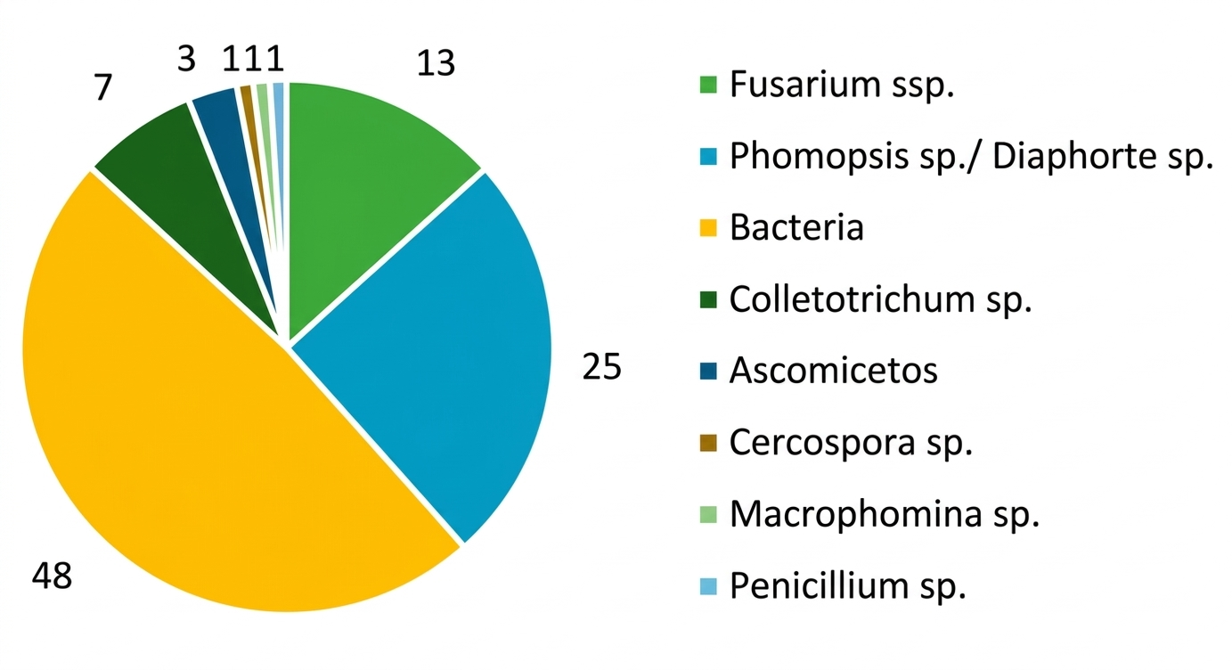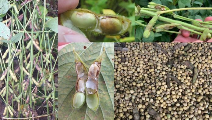 A partir de análises moleculares, os autores identificaram a presença de: Colletotrichum plurivorum, Colletotrichum gloeosporioides;  Diaporthe ueckerae, Diaporthe longicolla e Fusarium incarnatum equiseti nas plantas infectadas. Entretanto, não é possível afirmar até o presente momento que os fitopatógenos associados aos sintomas sejam a causa ou a consequência da podridão de grãos e sementes ou que possam contribuir com o desbalanço na relação fonte/dreno. Porém, em condições de alta umidade e temperaturas amenas, os fitopatógenos encontrados contribuem significativamente para redução da qualidade dos grãos, acarretando perdas significativas para os produtores (Belufi & Pittelkow, 2025).