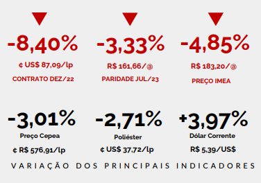 - REDUÇÃO: devido às incertezas quanto à economia global, o contrato dez/22 da pluma em NY exibiu queda de 8,40% no comparativo semanal, cotado na média de ¢ US$ 87,09/lp.