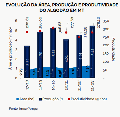 De acordo com o Imea, a área do algodão da safra 21/22 em MT foi de 1,18 milhão de hectares (ha), 22,41% maior que o registrado na safra 20/21