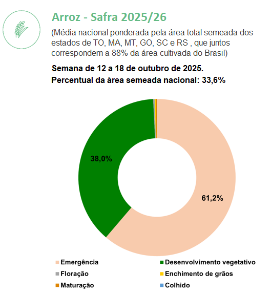 Em SC, o plantio avançou de forma gradual, acompanhando as variações climáticas regionais. Em GO, o plantio irrigado está em andamento em São Miguel do Araguaia, estando as áreas, em sua maioria, em emergência e desenvolvimento vegetativo. No MA, o plantio ocorreu em 94% das lavouras irrigadas, faltando finalizar a semeadura em algumas áreas de Viana e Grajaú. O plantio de sequeiro não foi iniciado.