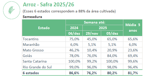 No RS, a semeadura alcança 98% da área prevista. Com a diminuição dos volumes de chuvas houve a conclusão do plantio nas áreas marginais, enquanto na Região Central houve evolução na operação. As lavouras estão em desenvolvimento vegetativo. Em SC, a semeadura foi finalizada e, apesar da melhoria no desenvolvimento das plantas, com maior incidência solar, a região Norte tem apresentado longos períodos com alta nebulosidade, atrasando o desenvolvimento vegetativo.