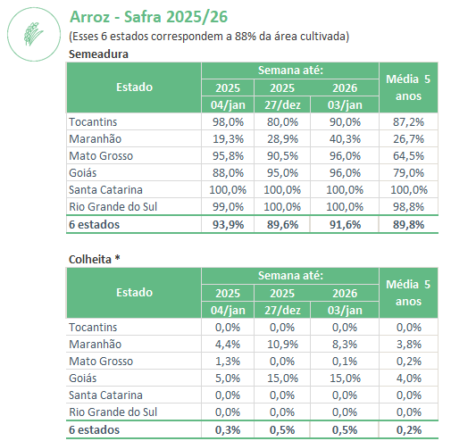 No TO, os produtores realizam os tratos culturais e as lavouras são favorecidas pelas boas condições climáticas. Em GO, continuam colheitas pontuais de arroz irrigado com registros de boa produtividade. As demais áreas apresentam ótimas condições de desenvolvimento. No MA, o plantio de sequeiro está em andamento no sul, centro, leste e oeste do estado, com a ocorrência de chuvas, enquanto continua a colheita do arroz irrigado. No PR, a maioria das áreas se encontram nos estádios reprodutivos e apresentam bom desenvolvimento.