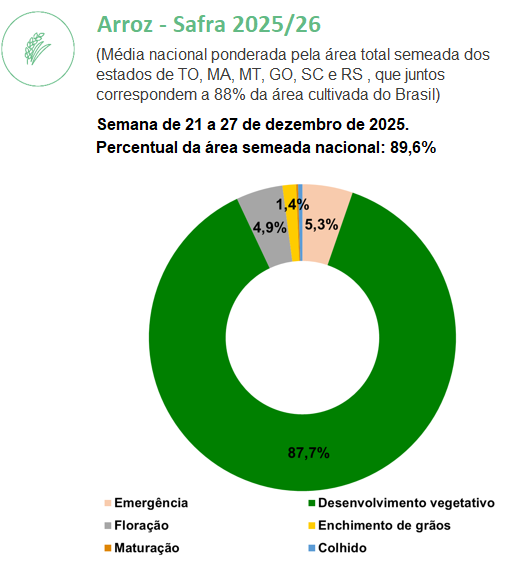 No RS, segue a realização dos tratos culturais, bem como o manejo da água de irrigação, que, com boa reserva hídrica, favorece a disponibilidade de água para a manutenção da cultura. A condição geral das lavouras é boa e muitas áreas estão no período de transição para a fase reprodutiva.