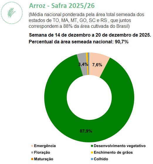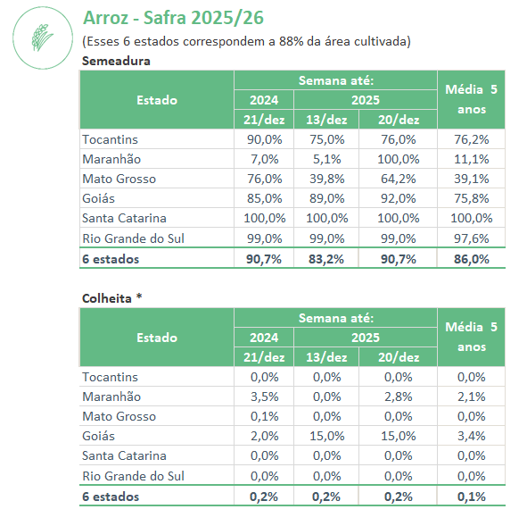 No TO, as chuvas estão normalizadas e com boa frequência o que vem paralisando a semeadura em algumas áreas. Em GO, a colheita segue em ritmo lento e escalonado. As lavouras seguem com bom desenvolvimento vegetativo e reprodutivo sob boas condições gerais. No MA, segue a colheita nas lavouras mais precoces, com manejo irrigado, enquanto ainda há plantio em áreas de sequeiro, especialmente no sul do estado. No PR, foi concluída a semeadura do arroz irrigado, sendo que essas lavouras seguem, majoritariamente, em desenvolvimento vegetativo. As condições gerais das lavouras são boas.