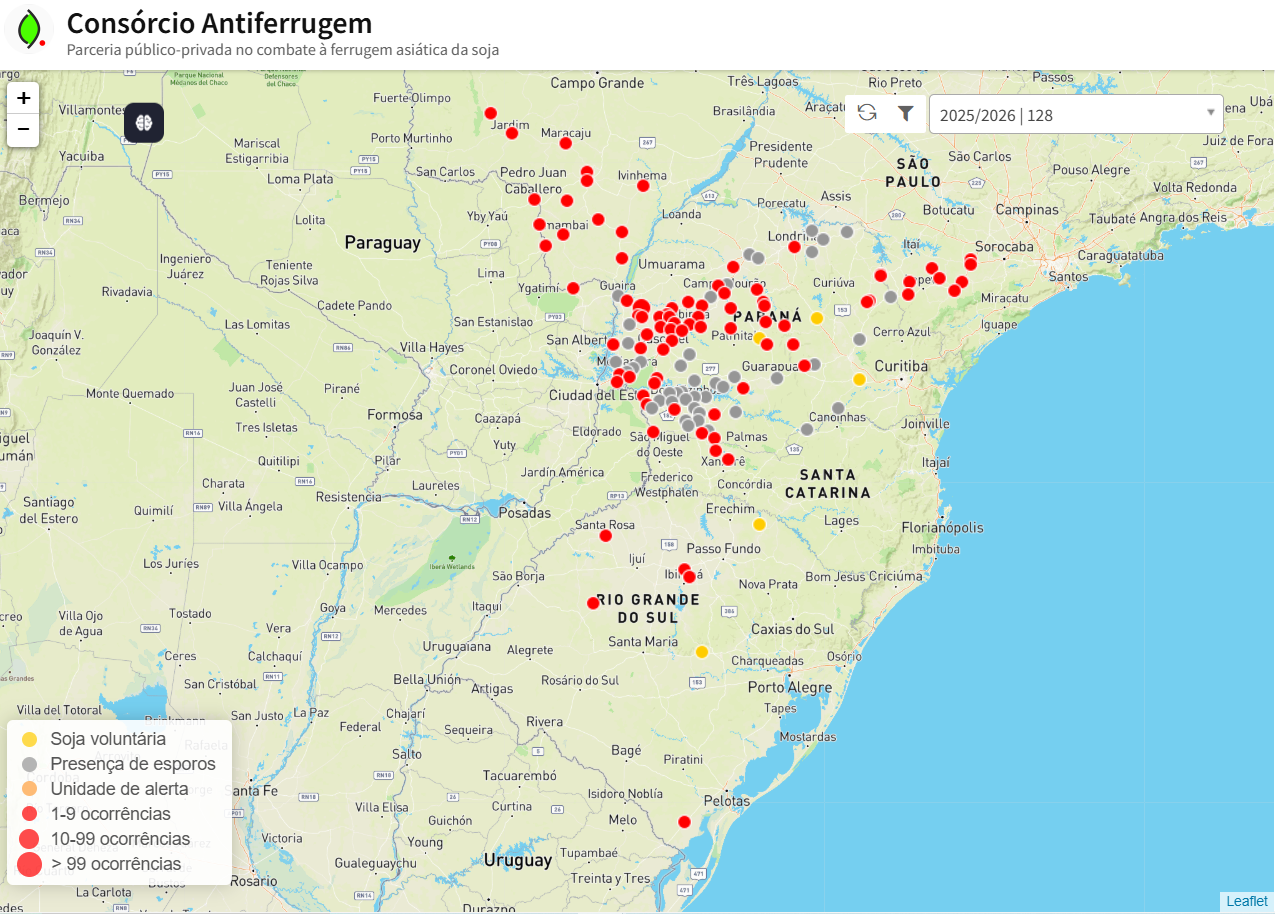 Os relatos da ocorrência de ferrugem-asiática (Phakopsora pachyrhizi) em lavouras comerciais vem aumentando na safra 2025/2026. Em apenas seis dias (de 2 de Janeiro a 8 de Janeiro), os casos relatados passaram de 91 para 128, uma aumento de aproximadamente 40% (Consórcio Antiferrugem, 2026).