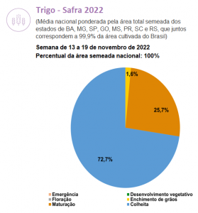 72,7% colhido. No RS, as condições climáticas favoreceram a maturação e a colheita, que evoluiu significativamente. As lavouras estão com ótima sanidade e a qualidade do produto colhido está boa. No PR, com o clima mais quente e com menos chuvas, houve avanço da colheita. A qualidade continua prejudicada pelo excesso de umidade no final do ciclo. Em SC, o menor volume de precipitações na última semana propiciou em pequeno avanço na colheita. As lavouras colhidas vêm apresentando boas produtividades.