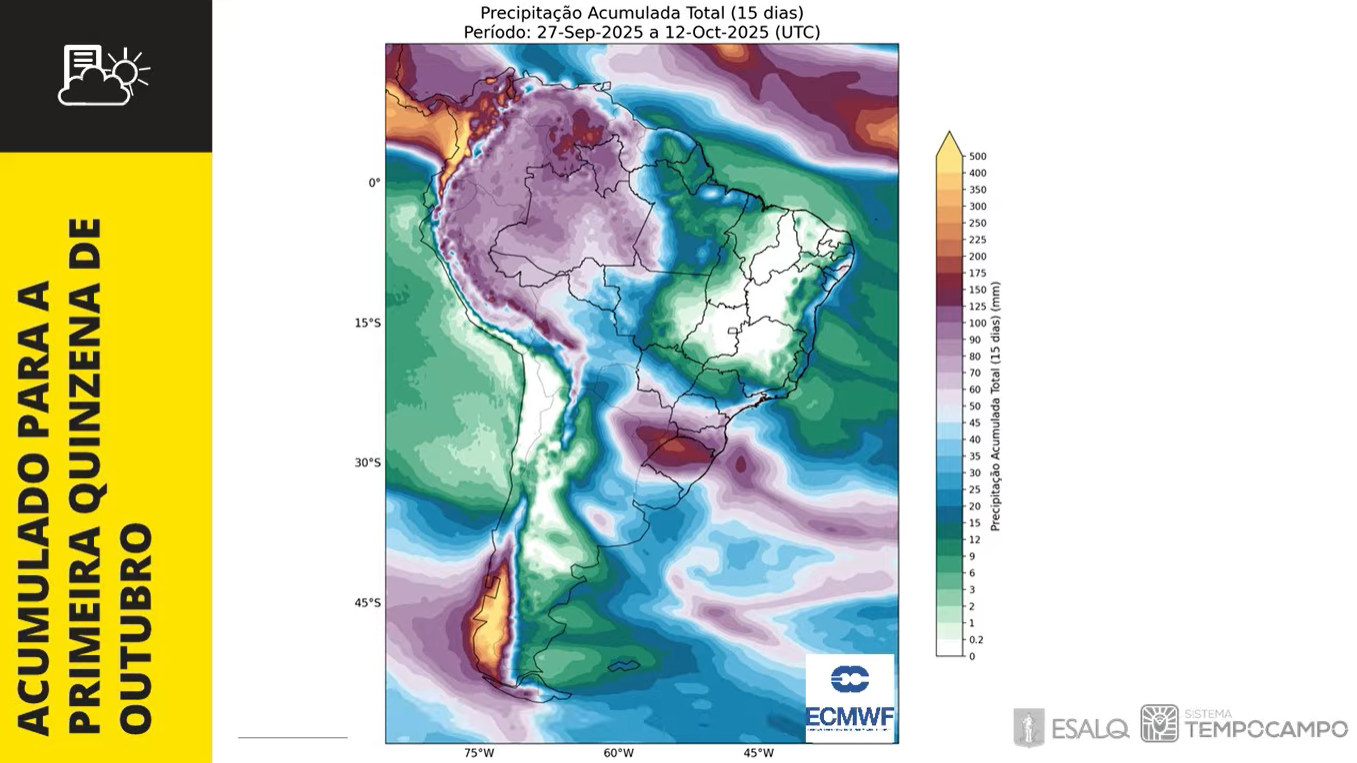 Para os primeiros 15 dias de Outubro, as previsões climáticas indicam volumes baixos de chuva para as regiões Leste e Nordeste do País, o que pode implicar em limitações para a semeadura e estabelecimento das culturas de verão. Já nas regiões Sul, volumes expressivos são esperados para o início do mês de Outubro.