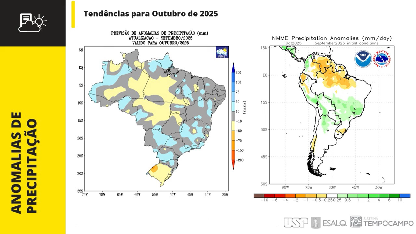 Figura 2. Tendência da anomalia da precipitação para o mês de Outubro de 2025. À esquerda INMET e à direita NOAA.