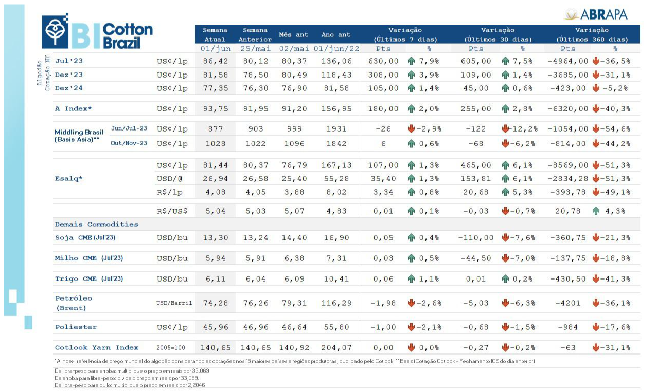 Algodão em NY 2 – Referência para a safra 2022/23, o contrato Dez/23 era cotado a 81,58 U$c/lp (+3,9%) e o Dez/24 a 77,35 (+1,4%) para a safra 2023/24.