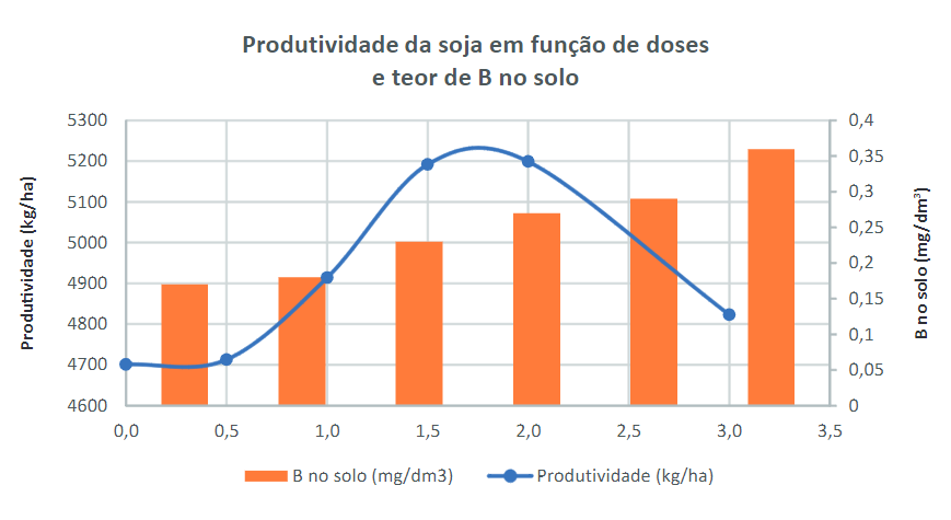 Avaliando a produtividade a soja em função da adubação com diferentes doses de Boro, Saldanha (2024) observou que, as melhores repostas de produtividade da soja são observadas com 2 kg ha-1 de Boro. Entretanto, para efeito de manejo, deve-se considerar o teor de Boro presente no solo e a requerimento nutricional da soja, para dada expectativa de produtividade.