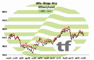 A cotação de julho, referência para a nossa safra de verão, fechou em baixa de -0,69% ou $ -3,25 cents/bushel a $ 469,00 A cotação para julho, fechou em alta de 0,63% ou $ 2,75 cents/bushel a $ 440,00.