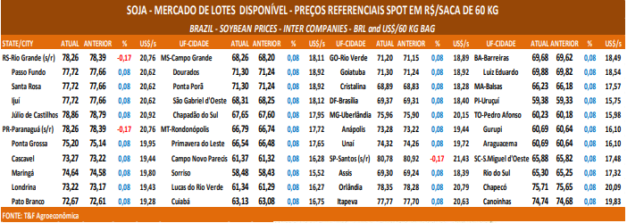 No porto de Dallian, na China, a soja física fechou a US$ 495,24 (492,30)/t, o farelo de soja a US$ 408,65 (409,35) e o óleo de soja a US$ 785,57 (773,89)/t. Em Rotterdam, o principal porto não-China de demanda de soja e subprodutos, a soja-grão foi negociada a US$ 382,50 (382,40), o pellets de soja foi negociado a US$ 365,00 (368,00 t.)