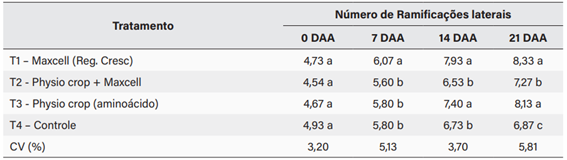 Tabela 1. Valores médios do número de ramificações por planta aos 0, 7, 14 e 21 dias após a aplicação (DAA) dos tratamentos testados.