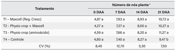 Tabela 2. Valores médios do número de nós por planta aos 0, 7, 14 e 21 dias após a aplicação (DAA) dos tratamentos testados.