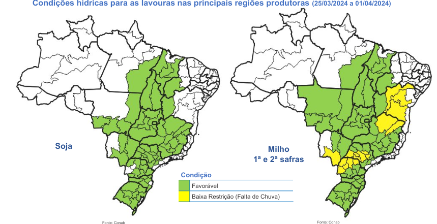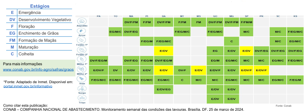 Na BA, as lavouras estão com bom desenvolvimento. No TO, a colheita tem apresentado rendimentos variáveis. No MA, a colheita avança no Sul e Sudoeste. Nas demais regiões, as lavouras apresentam bom desenvolvimento. No PI, a maioria das áreas está em maturação, sob boas condições.