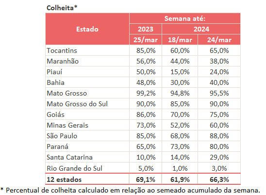 Em SC, a colheita está progredindo e as produtividades têm apresentado grande oscilação. No PA, a colheita está sendo concluída no Polo de Redenção e na região da BR-163. No polo de Paragominas e Santarém, as lavouras apresentam bom desenvolvimento.
