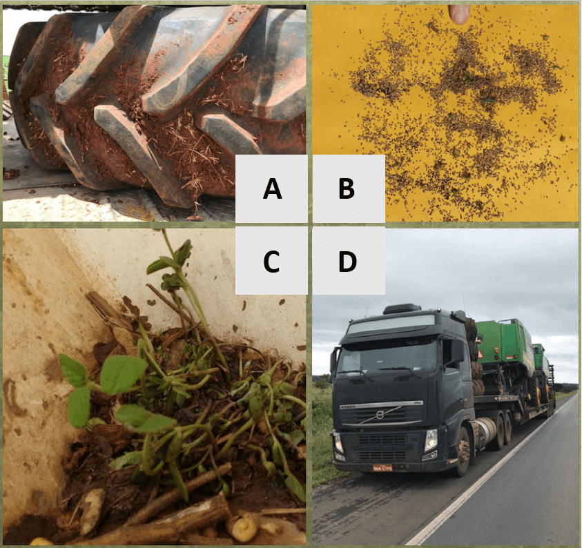 Figura 1. (A) Máquina contaminada com sementes de caruru; (B) sementes de caruru; (C) resíduos culturais; (D) transporte das colhedoras.