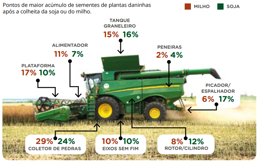 De acordo com Barroso; Albrecht; Gazziero, (2024), tanto na colheita da soja quanto do milho há diversos pontos de retenção de sementes de plantas daninhas, incluindo caruru. As regiões da plataforma de corte, do tanque graneleiro, do coletor de perdas e do eixo sem-fim concentram maior acúmulo de sementes, devendo, portanto, receber atenção especial durante o processo de limpeza.