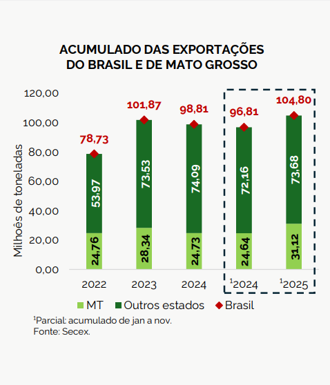 Vale destacar que a participação matogrossense nas exportações brasileiras durante o período foi de 29,69%. Esse movimento é sustentado, principalmente, pela maior produção de soja na safra 24/25, e pela forte demanda chinesa, que respondeu por 70,34% das aquisições do grão no estado no acumulado de 2025, totalizando 21,89 mi de t.