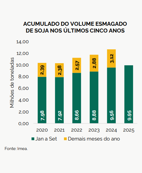 De jan/25 a set/25, o volume de soja esmagada em MT totalizou 9,95 milhões de t, alta de 4,08% em relação ao mesmo período de 2024 e 15,69% acima da média dos últimos cinco anos