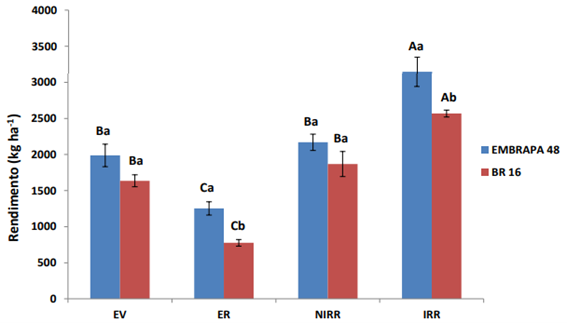 Figura 1. Rendimento (kg ha-1) em plantas das cultivares de soja BR 16 e Embrapa 48 submetidas a diferentes regimes hídricos. EV: estresse hídrico no período vegetativo; ER: estresse hídrico no período reprodutivo; NIRR: não-irrigado; IRR: irrigado.