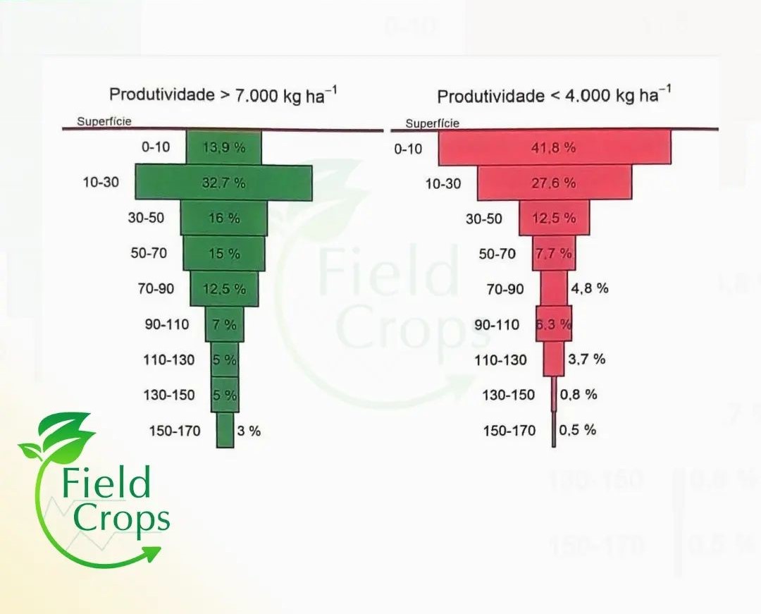 Plantas com raízes pouco profundas ou concentradas próximo à superfície exploram camadas superficiais do solo, mais propensas a perda de água por evaporação, e, portanto, são mais susceptíveis ao déficit hídrico. De acordo com Battisti & Sentelhas (2017) plantas de soja com mais de 50% do sistema radicular alocado em profundidades maiores que 30 cm são capazes de atingir produtividade superior a 7000 kg ha-1, enquanto plantas que concentram 70% das raízes até os primeiros 30 cm do solo não produzem mais de 4000 kg ha-1 (Equipe FieldCrops).