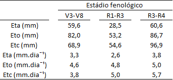 Tabela 1. Evapotranspiração real da colheita (ETa), evapotranspiração de referência da cultura (ET0) e evapotranspiração da colheita de soja em condições padrão (ETc), média (mm.dia-1) e acumulada (mm) para diferentes estádios da cultura da soja.